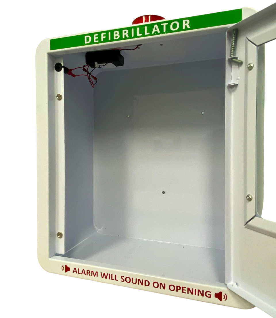 - A Plexiglass front window lets you view all AED unit status indicators without opening the cabinet.